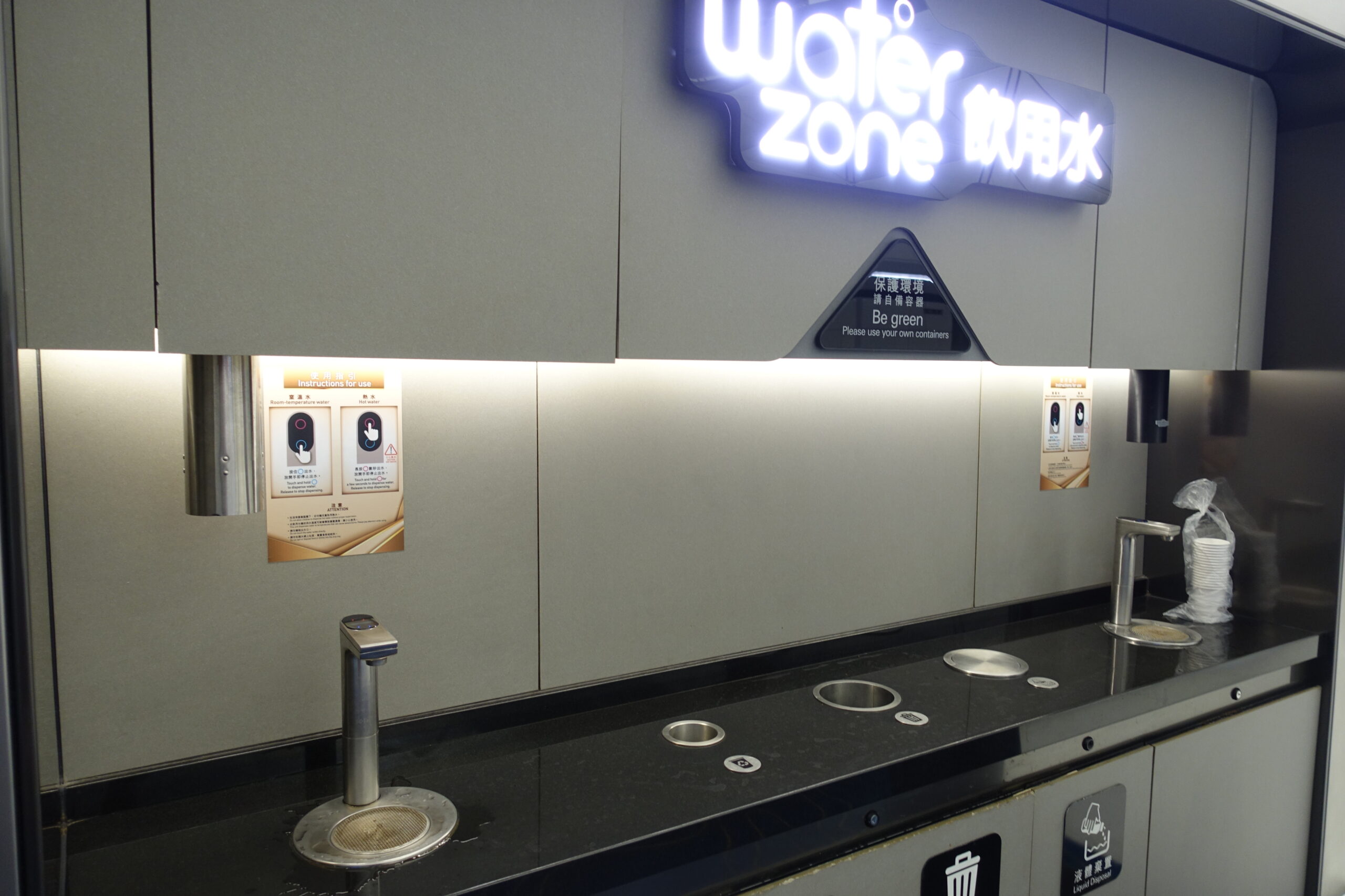 香港国際空港には、到着ロビーにはシャワールームがあり(ただ、私は利用していないため詳細不明)ました。また飲み水が組める給水設備が出発ロビーのいたるところにあります。(この点、おそらく同じ設備が到着ロビーにもあると思います。)